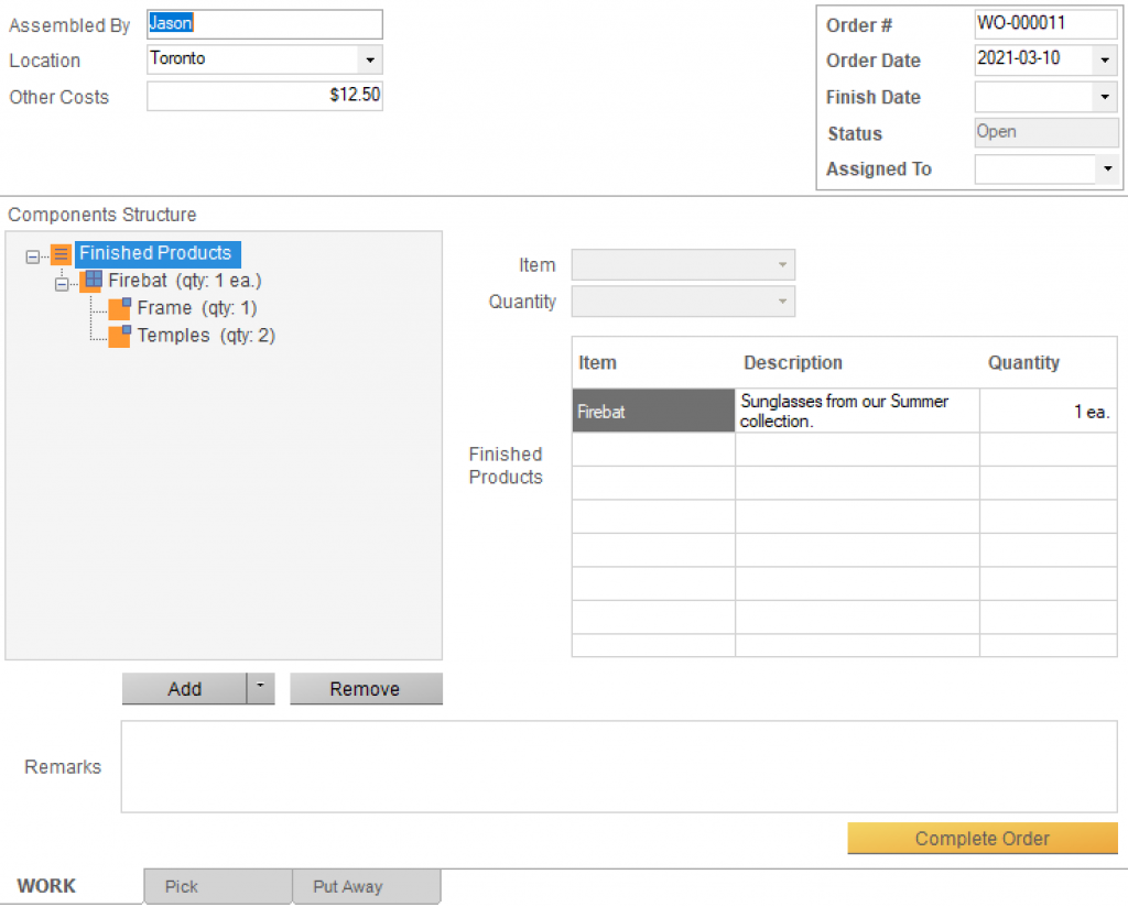 Work orders can also handle sub-assemblies, which means that you can assemble the components from multiple bill of materials on a single work order. This is a great way to keep accurate count of your components, while still ensuring accurate valuation of your finished goods.