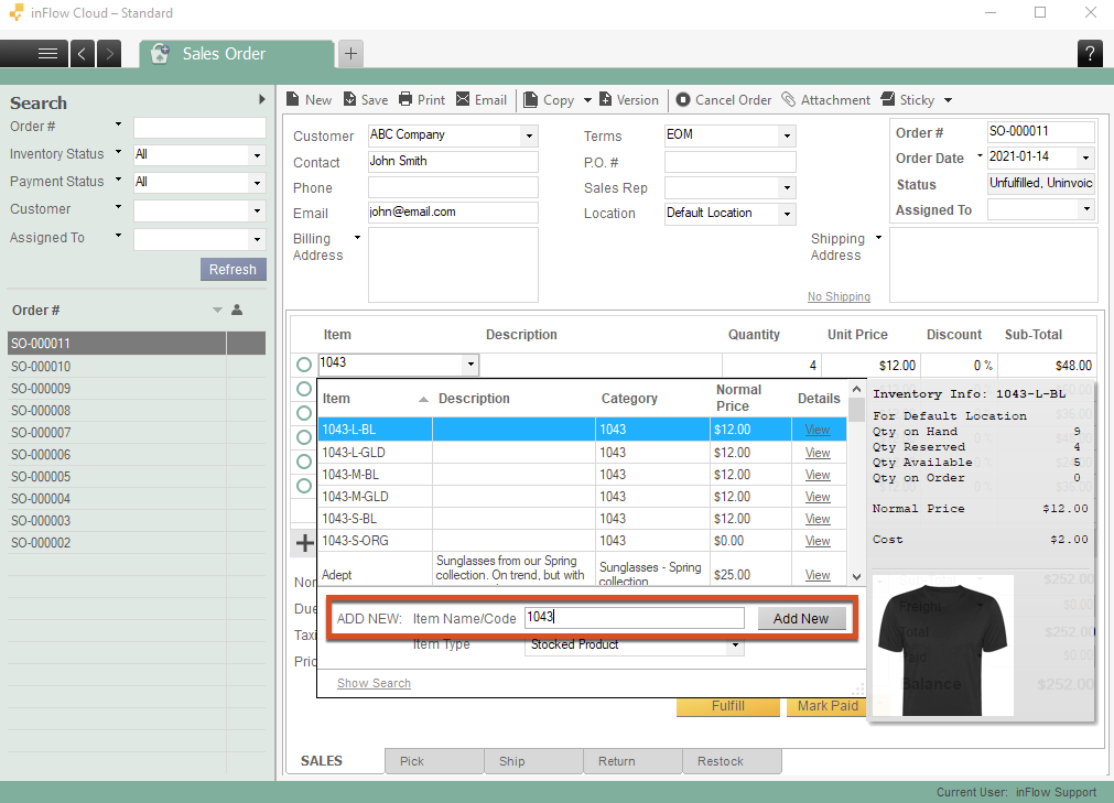- Open a new product record and enter the details for a Small Blue T-shirt (Eg. Item Code = 1043-S-Bl).
