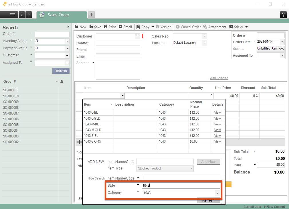 Depending on your naming convention, consider using the unique SKU number as the product name, or you can include the size and color when naming your variations. Because inFlow sorts your items alphanumerically, it can be a good idea to add your style number to the beginning of your product name for better sorting and tracking (see below):