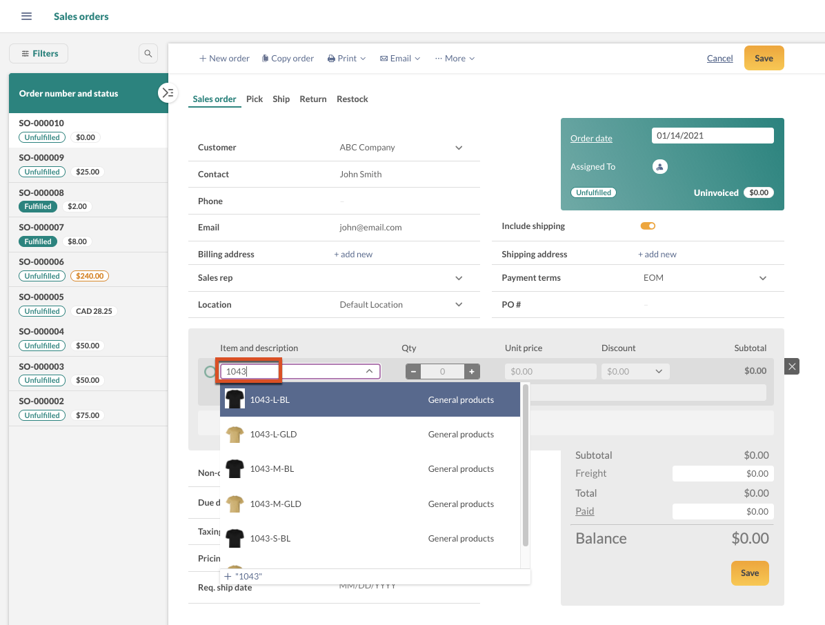 - Open a new product record and enter the details for a Small Blue T-shirt (Eg. Item Code = 1043-S-BL).