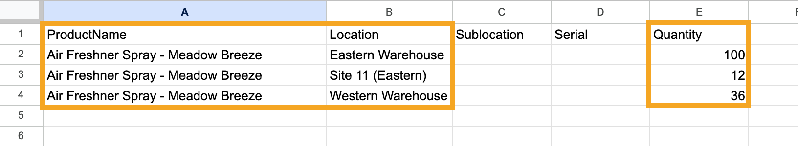 - When importing serialized products, repeat the product name multiple times in the spreadsheet for each serial number you have in stock.
