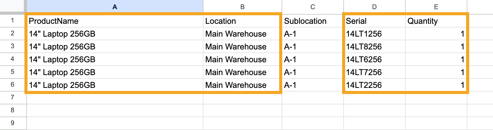 To import serialized products, include the mandatory columns from above, along with the Serial column.